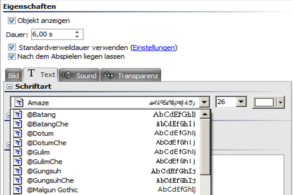 Hallo Frau Thaler, hallo Herr Fläcky, Die Schrift wird in der Diashow 9 in der Auswahl angezeigt und ist, soweit ich es beurteilen kann, auch eingeblendet. Ich habe Bildschirmausdrucke als jpg-Bilder angehängt. Vielleicht können Sie daran erkennen ob ich etwas falsch gemacht habe. Mit freundlichem G...