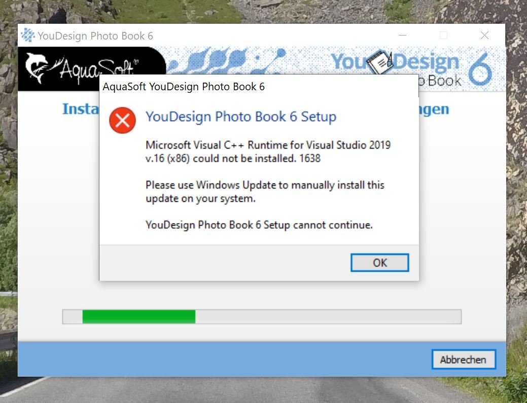 Hallo Ich habe mir die Testversion für 30 Tage von YouDesign Photo Book heruntergeladen. Das Programm lässt sich leider nicht installieren. Windows 10 hat die neusten Updates. Fehlermeldung siehe Anhang. Tippe ich auf weiter, kommt die gleiche Meldung nach einiger Zeit und die Installation wird abge...
