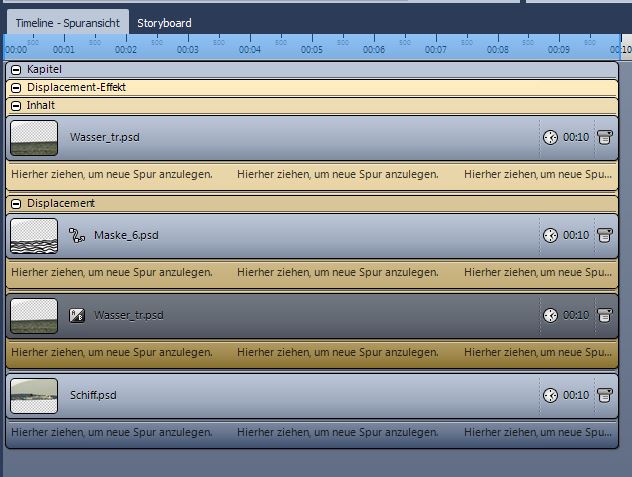 Ein Foto (Schiff im Wasser 300m vor Land von anderem Schiff aus fotografiert) das Wasser freigestellt und nun das Wasser in die Ebene für das Bild (obere Ebene) und die Maske in die Ebene für die Maske eingefügt. Bewegungspfad angelegt und schon bewegt sich die Wasseroberfläche. Den Rest des Bildes muß man in die obere Spur legen. Sicher Ausbaufähig aber eine Möglichkeit der Nutzung.