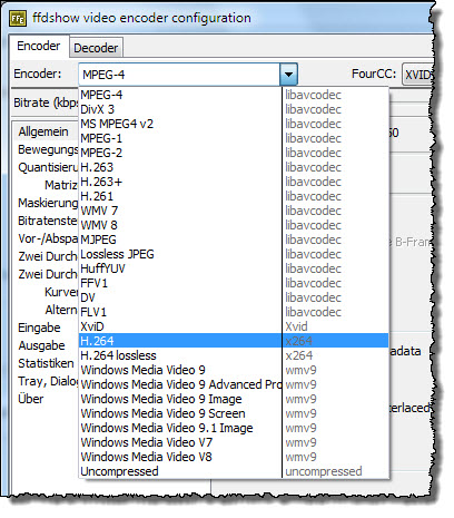 Schau mal nach, ob der H.264 im Encoder-Menü von ffdshow auftaucht?