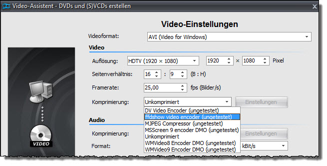 Leider erscheinen im Video-Assistenten nach wie vor die neu installierten Codecs nicht. Für die Einstellung der Komprimierung stehen weiterhin nur die Einträge "DV Video Encoder", " MPJPEG Compressor" und "unkomprimiert" zur Verfügung. Ich habe auch die UAC (User Access Control) ausgeschaltet und danach ffdshow neu installiert (weil die UAC in besonderen Fällen die Speicherung von Daten umleitet). Auch diese Maßnahme hat mich nicht weitergebracht.