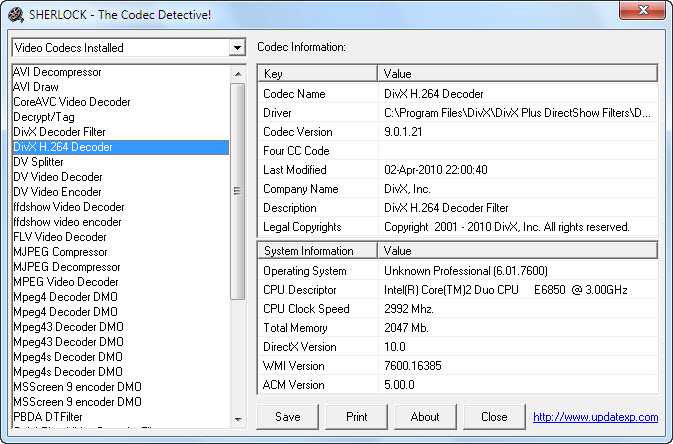 Weiterhin habe ich mit dem Sherlock Codec Detective und Codec Sniper die Divx und ffdshow Eintragungen geprüft und ich habe dabei keine abnormalen Situationen feststellen können (siehe 2xAnhang).