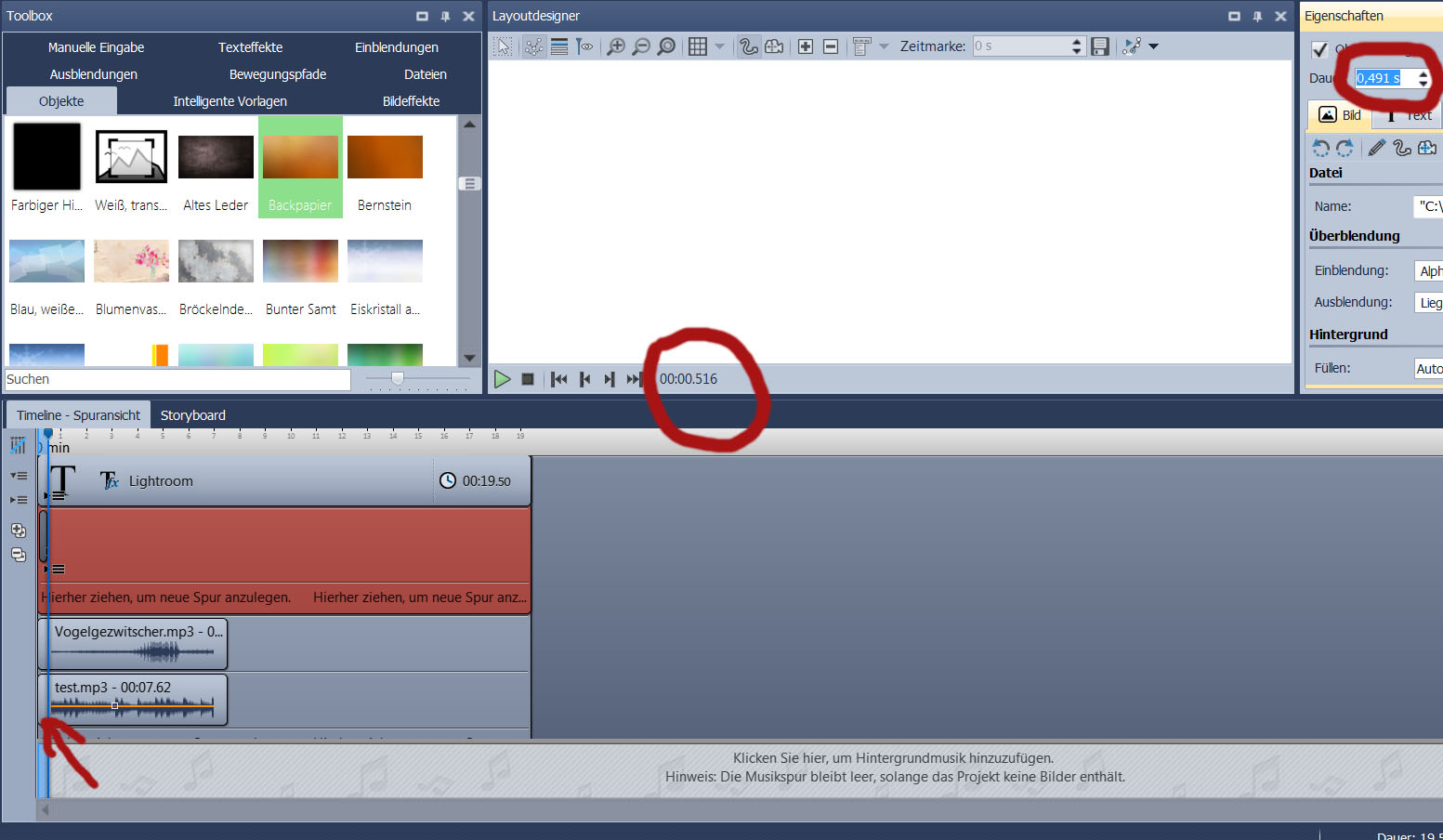 Die hier auf dem Beispiel verwendete Sounddatei "Test" ist 7,053 sek lang.Bei Stages sieht man, dass die Sounddauer vom Objekt mit 7,62 sek angegeben wird.