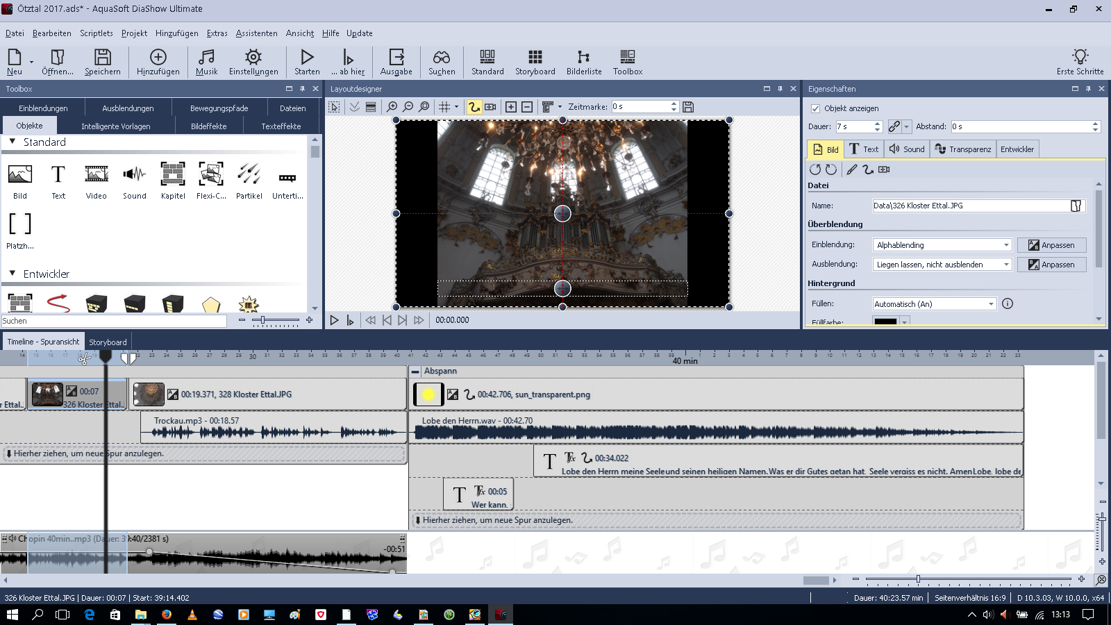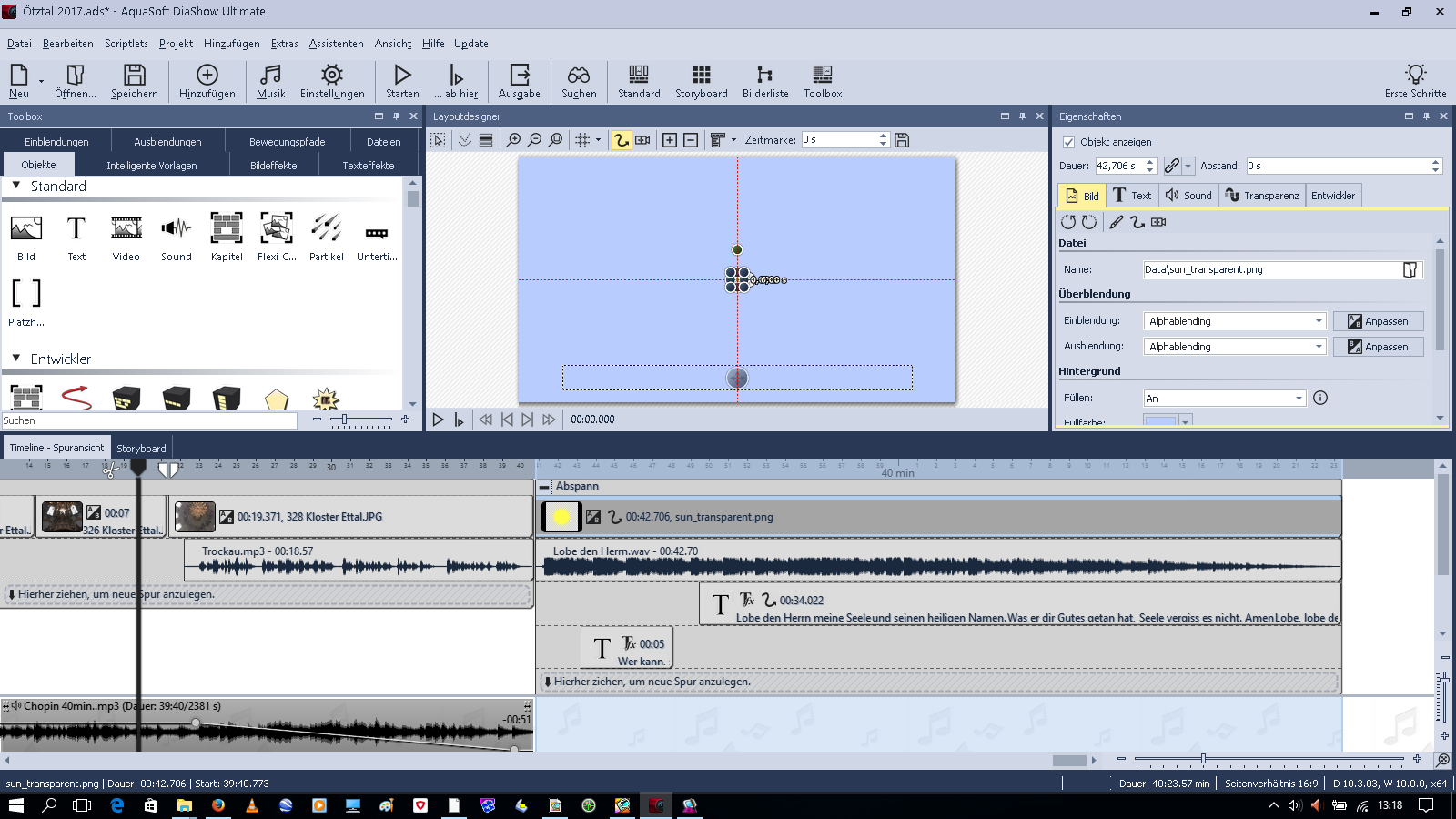 Beim Übergang vom Bild 328 zu Kapitel"Abspann" erscheint das Bild 326 nochmal kurz und beim Beenden der DS erscheint das Bild 326 ebenfalls nochmal kurz. Ich habe für "sun_transparent" im Kapitel die Ausblendung "Alphablending" gewählt. Wenn ich den Start ins Bild 328 setze, ist alles ok!?!