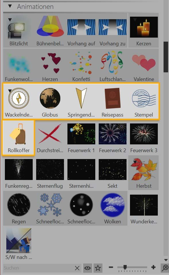 Im Bereich "Animationen" gibt es sechs Objekte, die sich auch bewegen (allerdings keine GIFs, sondern beliebig skalierbare Grafiken).