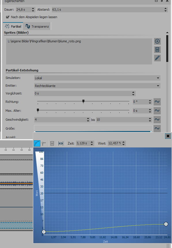 Wenn Sie ein Partikelobjekt in die Timeline einfügen erhalten Sie in den Eigenschaften eine Vielzahl von Einstellungsmöglichkeiten. In Stages können diese Einstellungen zusätzlich als Kurve oder sogar Kurvenbereich über die Zeit gesteuert werden (die Umstellung von Wert auf Kurve, etc. kann direkt mit einem Klick auf das Icon hinter jedem Wertefeld vorgenommen werden).
