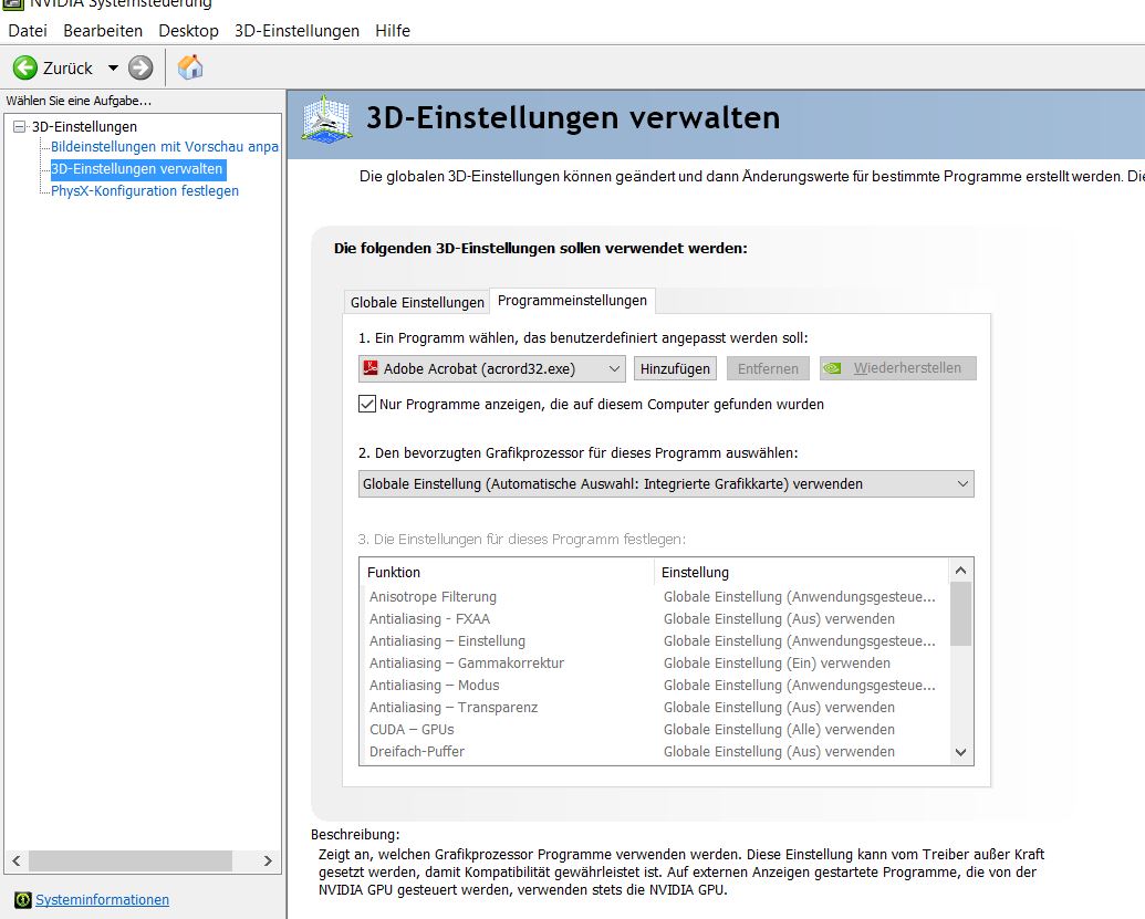 Es ist die Nvidia-Systemsteuerung zu öffnen. Dort 3D-Einstellungen verwalten anklicken. Warum das unter den 3D-Einstellungen zu finden ist, ist das kleine Geheimnis der Entwickler und erschließt sich mir nicht. Dort wiederum den Reiter Programmeinstellungen. Jetzt kommt der ganz wesentlich Punkt: Hast Du nur einen Grafikprozessor (wie bei mir), so fehlt dort die Zeile 2. Den bevorzugten Grafikprozessor für dieses Programm auswählen:. Ist diese Zeile jedoch vorhanden, so wählst Du unter 1. Ein Programm wählen, welches benutzerdefiniert angepasst werden soll: das Diashow-Programm (zum Abspielen nur den Player.exe) aus und weist diesem unter 2. den Nvidia-Grafik-Prozessor zu. Fertig. Rufst Du nun das so eingestellte Programm auf, so wird automatisch der Hochleistungsgrafikchip für die Grafikbearbeitung genutzt. Aber Vorsicht: Diese Einstellung leert den Akku des Laptop schneller als einem lieb ist. Am besten nur im Netzbetrieb wählen.