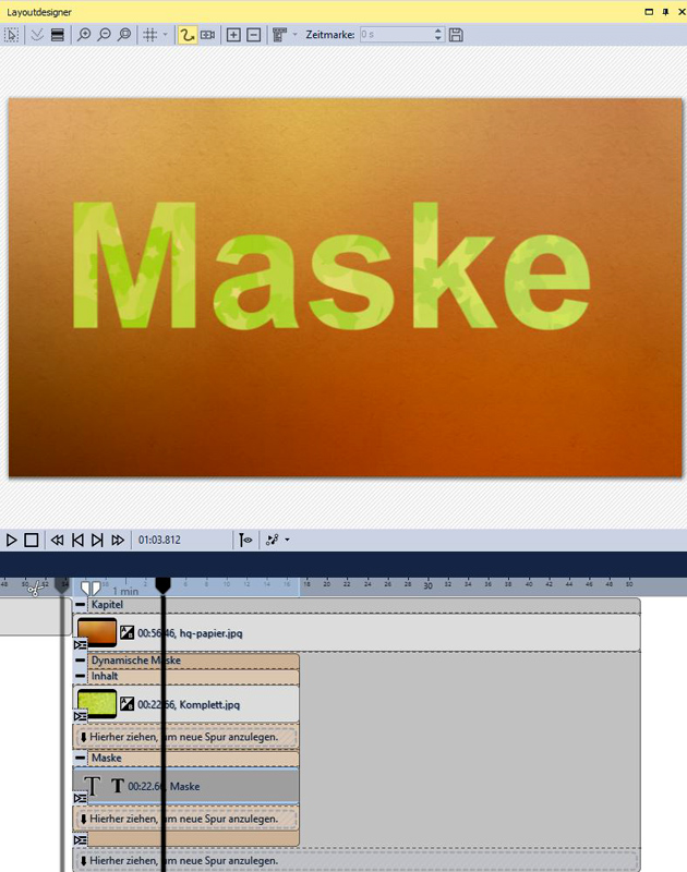 In die zweite Spur kommt die Maske "Textmaske" und gibst im Eigenschaftsfenster deinen Text,Textgröße usw. ein und schon bist du fertig.