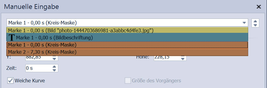 Das Problem tritt zumindest bei mir nicht auf, wenn ich Bilder einfach aneinanderreihe. Nutzt man jedoch Kapitel mit mehreren Spuren, so kommt es zur Anzeige der Bewegungsmarken mehrerer Bilder im Fenster für die manuelle Eingabe, und zwar offenbar immer dann, wenn sich Bilder in mehreren Spuren zeitlich überschneiden. Allerdings passiert dies offenbar priorisiert nach Spuren, d. h. es werden alle Bewegungsmarken des angewählten Bildes und aller sich damit überschneidenden Bilder in den darüber liegenden Spuren angezeigt. Bewegungsmarken von Bildern in weiter unten liegenden Spuren werden nicht angezeigt.
