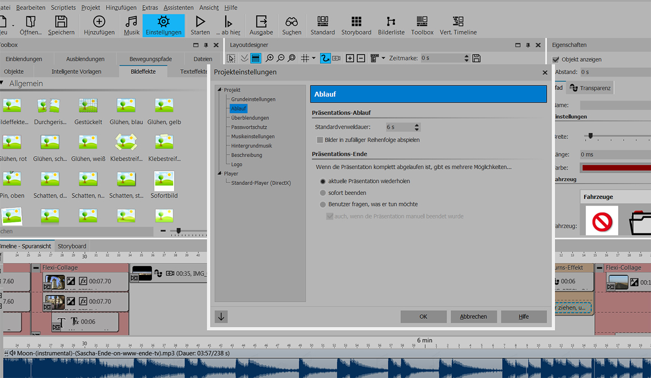 unter Einstellungen - Projekteinstellungen - Ablauf - kannst Du die Standardverweildauer einstellen auf die Zeit, die Du für alle Bilder haben möchtest. Ansonsten kannst Du noch individuell die Verweildauer der einzelnen Bildobjekte im Eigenschaftsfenster verändern.