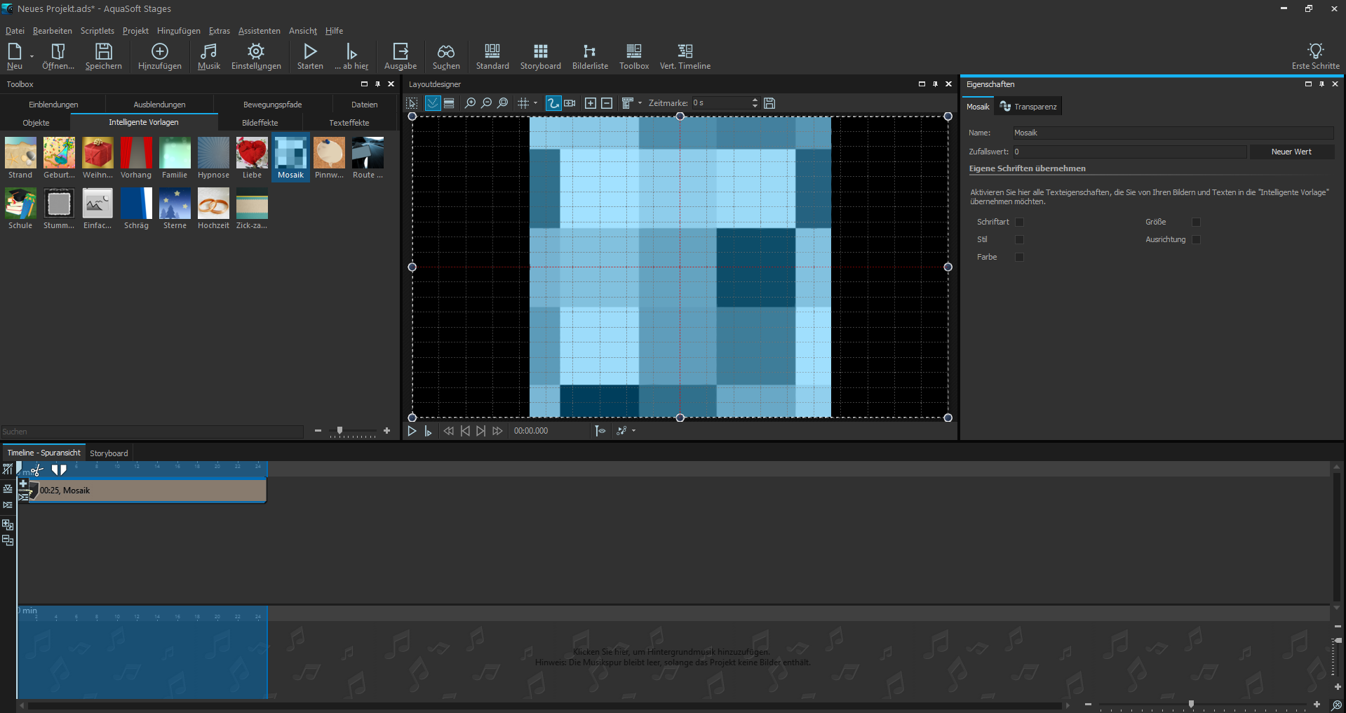 hexenfeger hat geschrieben:@Werni, probier's einfach mal aus. Öffne die Beispieldatei Mosaik, dann die Einblendung für das Mosaikfoto z.B. auf Wassertropfen mit gleicher Länge wie das Foto selbst einstellen. Ich finds cool :-D. Achja du hast ja auch Stages, also kannst du dort wohl über die Kurve die Steinchen in sich drehen lassen. Bei 10U geht das nicht. Aber du kannst es über die Einblendung wie in meinem letzten Thread flirren lassen :-D