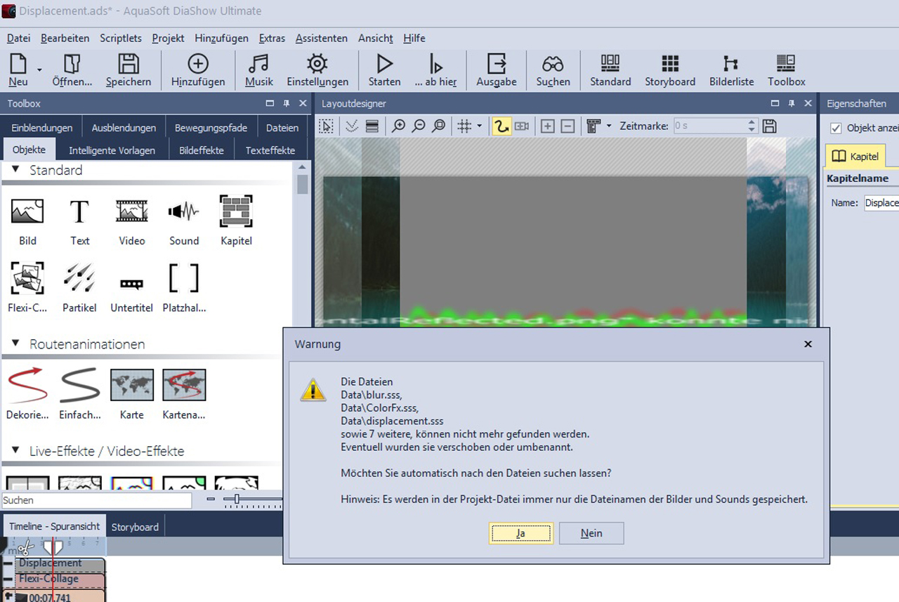 Jedoch habe ich zufällig festgestellt, dass beim öffnen von Beispielprojekten nicht alle Objekte gefunden werden. Dies ist z.B. beim Displacement-und Mosaik-Effekt der Fall.