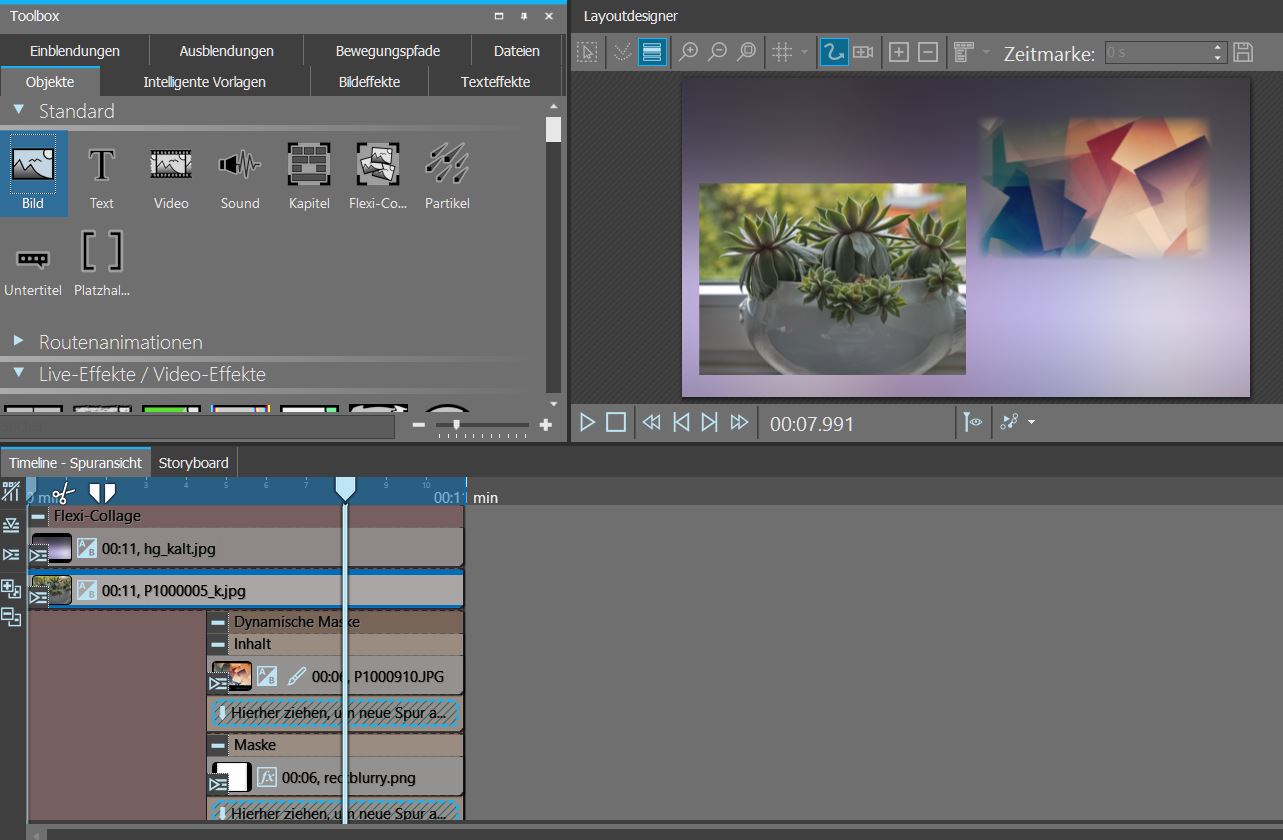 Wenn ich in eine Flexi-Collage mit 2 Bildern eines davon mit einer Maske versehe, um beispielsweise einem dort gewählten Bildausschnitt einen weichen Rand zu geben, und dies mit mit dem Maskeneffekt erledige, dann stelle ich fest, das immer erst die Maske beim Ablauf der Show erscheint und kurze Zeit später das Bild unabhängig von den Einblendungen die man wählt. D.h., es erscheint immer erst im Layoutdesigner die Maske (schwarzer Bildausschnitt) und sekundenbruchteile später erst das Bild. Das sieht sehr unschön aus! Gibt es eine Möglichkeit, dies zu synchronisieren. D.h., das Bild und Maske des Maskeneffekts eingebaut in einer Flexi-Collage synchron erscheinen. Mir ist es nicht gelungen.