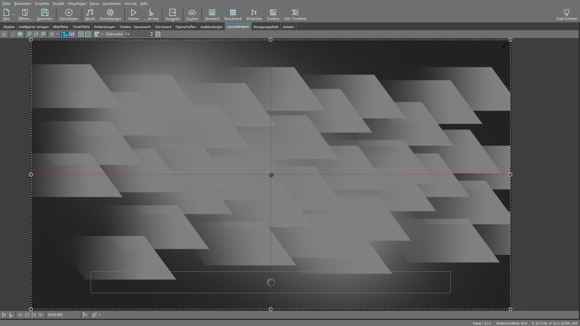 Per einfachem Knopfdruck wird das Fenster vergrößert, wobei Eigenschaften und Toolbox schmaler gemacht werden, die Timeline bleibt unverändert. Wenn ich diese Funktion immer wieder nutze (hängt von der jeweiligen Show ab), mache ich dieTimeline immer so schmal wie es gerade noch tragbar ist. Leider ist in vielen Fällen der Monitor - egal wie groß er ist - immer zu klein