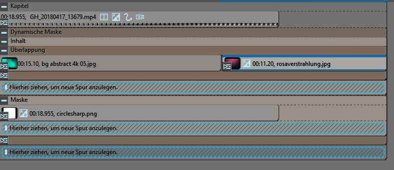 Wenn daher ein Video vor wechselten Bildern gezeigt werden soll und gleichzeitig, das das letzte Bild des Videos als Standbild angezeigt wird, so muss man das Video in die 1. Spur bringen und zu diesem Zwecks die Maske natürlich umkehren: