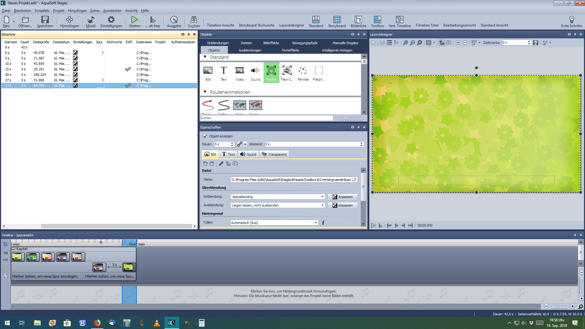 Was mein Ansinnen an Aquasoft betrifft, Roland, hast du wahrscheinlich recht. Andererseits dürfte die Zahl der wirklich optimalen Oberflächen nicht allzu groß sein. Was du da aufgebaut hast, sieht genau so aus, wie ich mir's mit allen früheren Versionen einrichten konnte. Warum mir das mit Stages 10 nicht gelingen will, ist mir bislang rätselhaft. Nach einigen ersten Schritten, fliegt mir alles wieder untereinander oder übereinander - obwohl ich übrigens den gleichen PC (Acer, Win 10, 64 Bit) habe wie du. Bitte überleg doch mal, ob du mir deinen Zusammenbau nicht als view-Datei übermitteln könntest. Das wäre riesig.