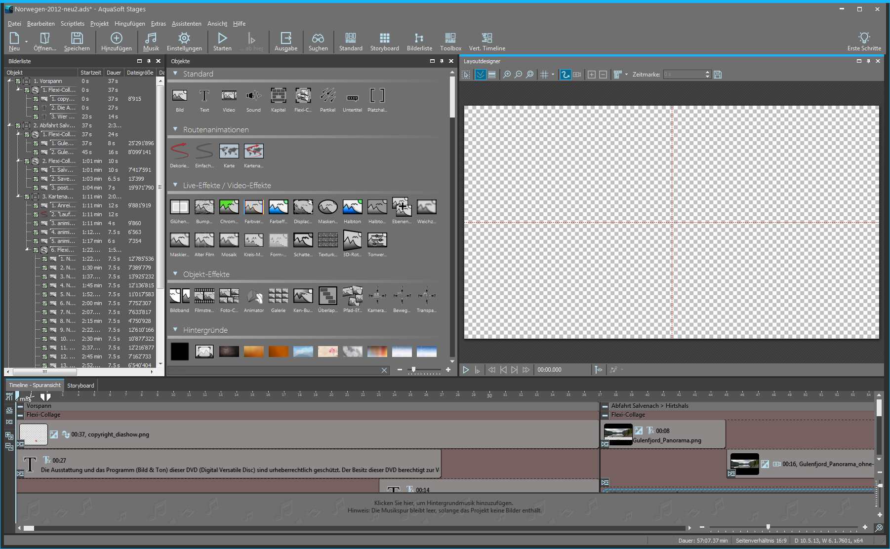 Obwohl ich langjähriger Nutzer fast aller Aquasoft-Diaschau-Versionen bin, schaffe ich es bei Stages 10 nicht, mir die Benutzeroberfläche mittels drag & drop so benutzerfreundlich einzurichten, dass ich wie gewohnt auch mit Stages 10 arbeiten kann. Deshalb wäre es schön, wenn Aquasoft eine Reihe von alternativen Benutzeroberflächen in Gestalt von * .view-Dateien anbieten würde, damit die weniger Geschickten, wie ich, auswählen können. Was ich nicht hinkriege in Stages sieht etwa so aus: Ganz links oben die Bilderliste, rechts daneben übereinander Toolbox und Eigenschaften, rechts daneben LayoutDesigner und unter all dem in voller Breite die Timeline mit all ihrem Zubehör.