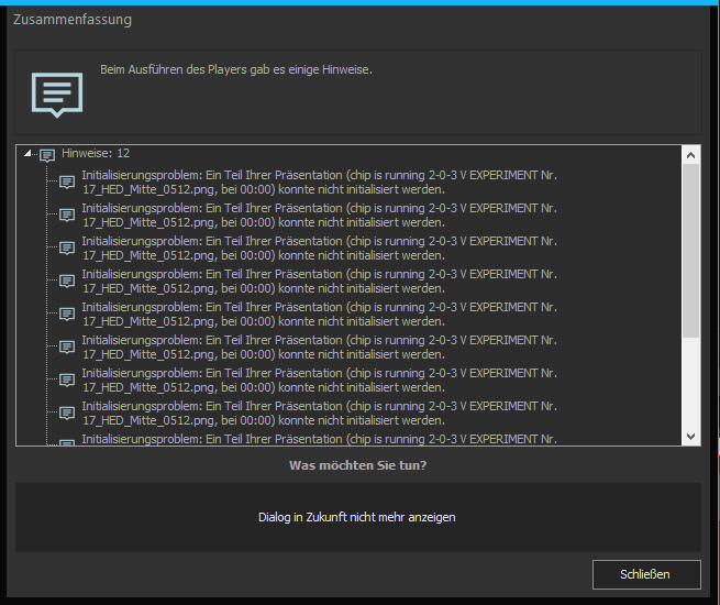 Tritt der Fehler reproduzierbar bei Ihnen auf? Hat er Auswirkungen auf das Abspielen? In unserem System steht, dass "die Shows augenscheinlich korrekt wiedergegeben werden". Damit hat der Fall eine niedrigere Priorität bekommen.