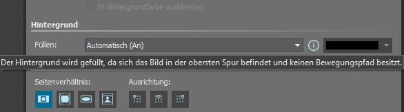 Im Bereich für die Hintergrundeinstellungen befindet sich zwischen Füllen und dem Farbauswahlfeld ein eingekreistes i. In allen mir sonst bekannten Programmen kann ich mit der Maus über ein solches i-Symbol fahren - manchmal muss ich es auch anklicken - und schon geht ein kleines Hilfefenster mit einer lokalen Information auf. Hier passiert jedoch gar nichts. Kommt da noch was oder habe ich etwas übersehen?