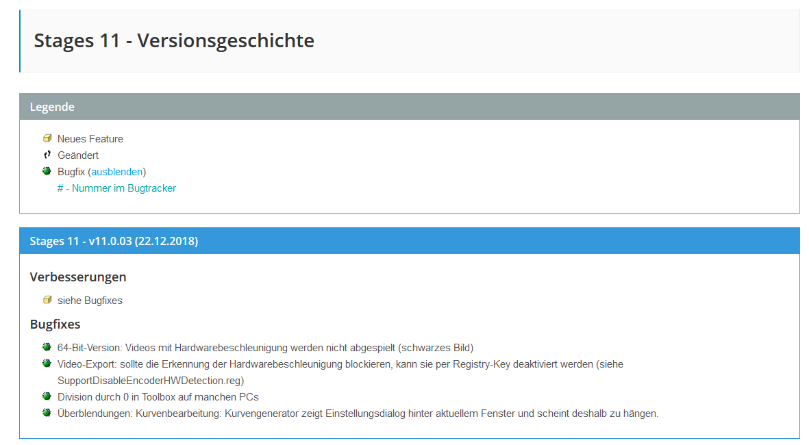 Die Info, dass es für Stages 11 eine Version 11.0.04 gibt, habe ich in einer Werbemail von Aquasoft am 28.12.2018 auch erhalten. Allerdings bietet weder das Programm selber das Update an noch habe ich irgendwo sonst eine aktuellere Datei als die 11.0.03 gefunden :-(