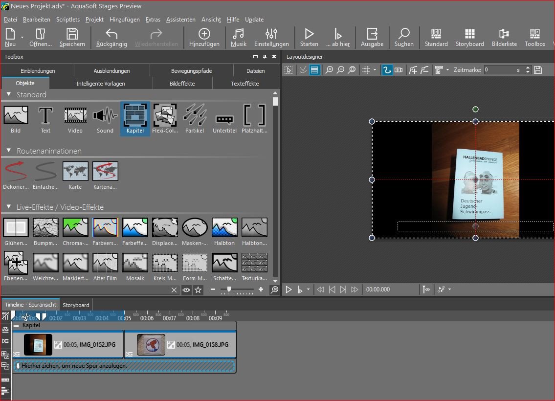 wenn ich auf das +-Zeichen klicke, öffnet sich ein Fenster, in dem die einzufügenden Dateien ausgewählt werden können. Standardmäßig öffnet es sich bei mir mit dem "Auswahltyp" "alle unterstützten Bildformate (Button ganz unten rechts im Fenster). Hier kannst Du den Dateityp ändern, beispielsweise auf "alle unterstützen Videoformate". Liegt es vielleicht daran oder kannst Du tatsächlich gar keine Videodateien einfügen? Ansonsten gäbe es in dieser Auswahlliste noch "alle unterstützten Formate", ich fände es hier sinnvoll, diesen Punkt standardmäßig für die Auswahl vorzubelegen.