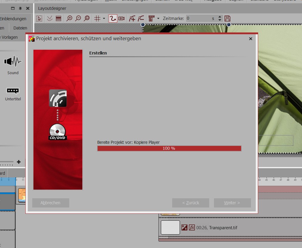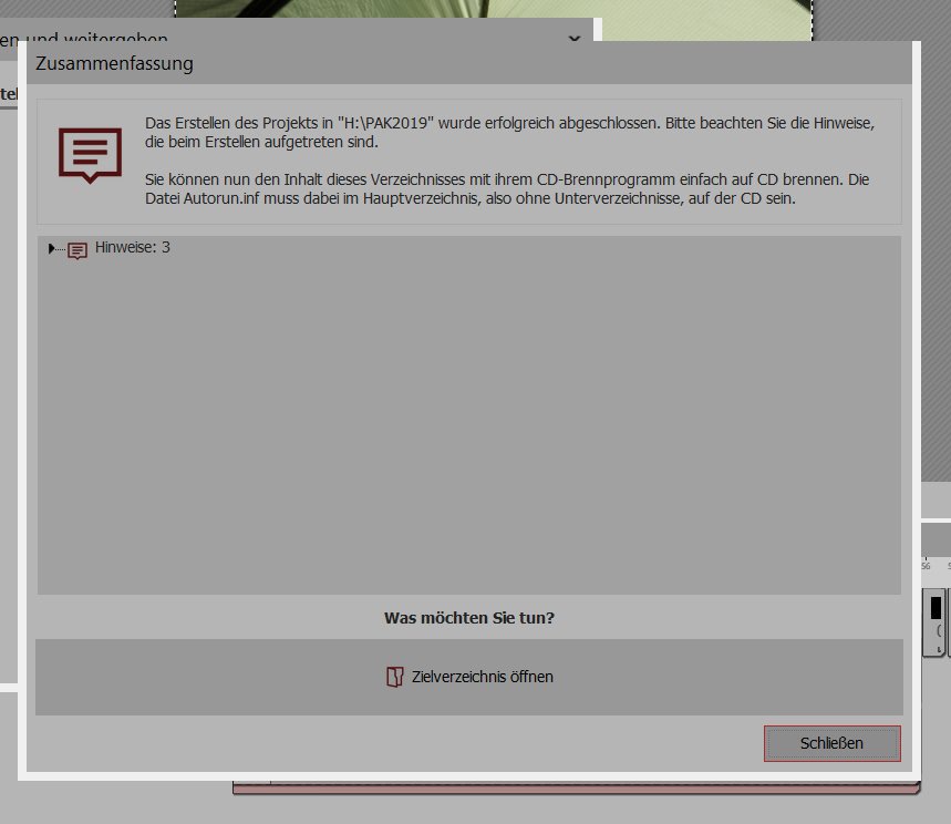 4.) Über Assistenten Projekt archivieren das Verzeichnis "PAK2019" ausgewählt mit Player und Schriftarten, unverschlüsselt.