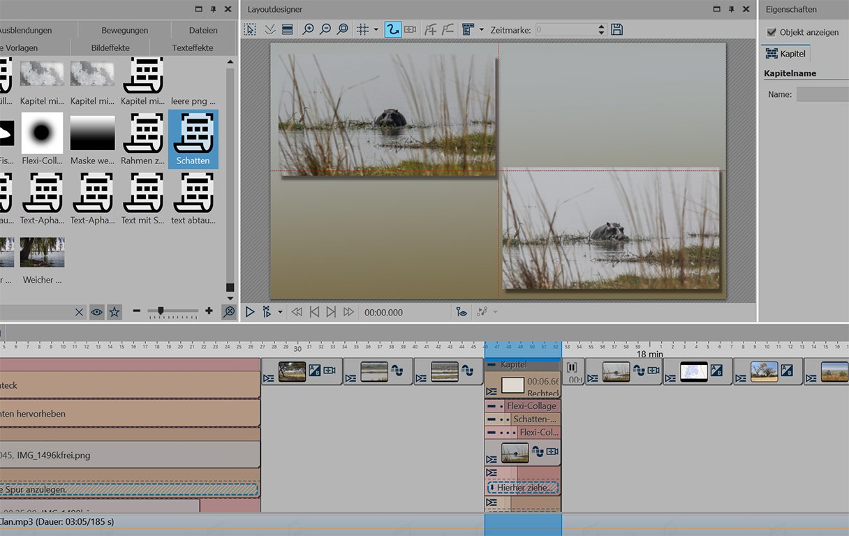 Wenn ich auf eine Bild einen Zoom lege mittels Kamerafahrt, dieses Bild in eine Flexi-Collage packe und diese für eine Collage skaliere und anschließend diese Flexi-Collage in einen Schatten-Effekt packe (die Flexi-Collage hat auch eine Einblendung - schieben), dann haben die Bilder bei Ablauf der Flexi-Collage einen helleren Rand entsprechend der Einstellung in dem Schatten-Effekt (s. Anhang). Dieser Rand verschwindet erst vollständig, wenn die Einblendung beendet ist. Ist das normal, oder mache ich da etwas falsch?