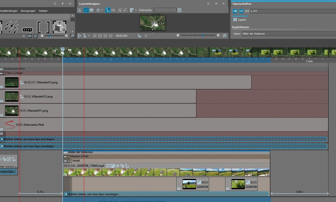 ein Kapitel -> darin Kartenanimation in dieser eine Flexi-Collage mit drei Bildern einer Landkarte und den dekorierten Pfad dazu. Die Flexi-Collage wird nach unten bewegt und der dekorierte Pfad ebenfalls, dadurch ist im Bild die Animation zusehen. Jetzt soll an bestimmten Punkten die Animation stehen bleiben um in diesen Zeitraum Bilder anzuzeigen. Damit die Pfadanimation stehen bleibt muss ich auch dort Standzeiten eintragen. Diese unterscheiden sich von denen in der Flexi-Collage. Gibt es eine bessere Lösung für die Synchronisation (Standzeit) beider Bewegungen ?