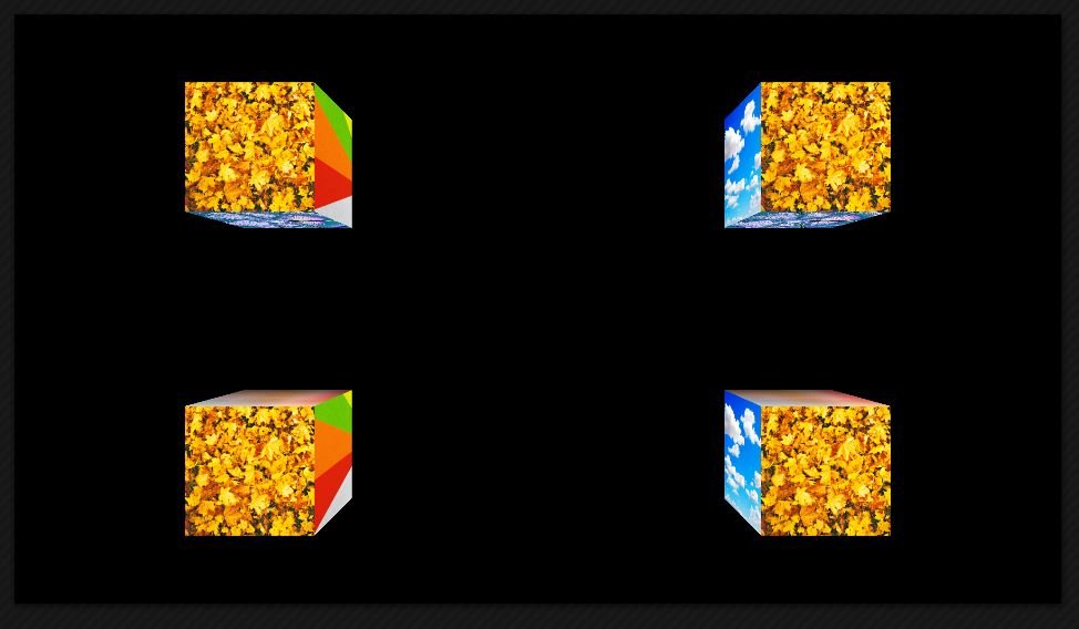 Das ist jedoch weit entfernt von dem, was ich anzeigen will. Ich will einen in jedem Quadranten exakt eingepassten rotierenden 3D-Würfel sehen. ich kann jetzt hier natürlich noch an den Parametern "Größe der FlexiCollage" und "z-Koordinate" rumschrauben, das ist aber versuchendes Gefummel, statt logischer Einstellung von Parametern.