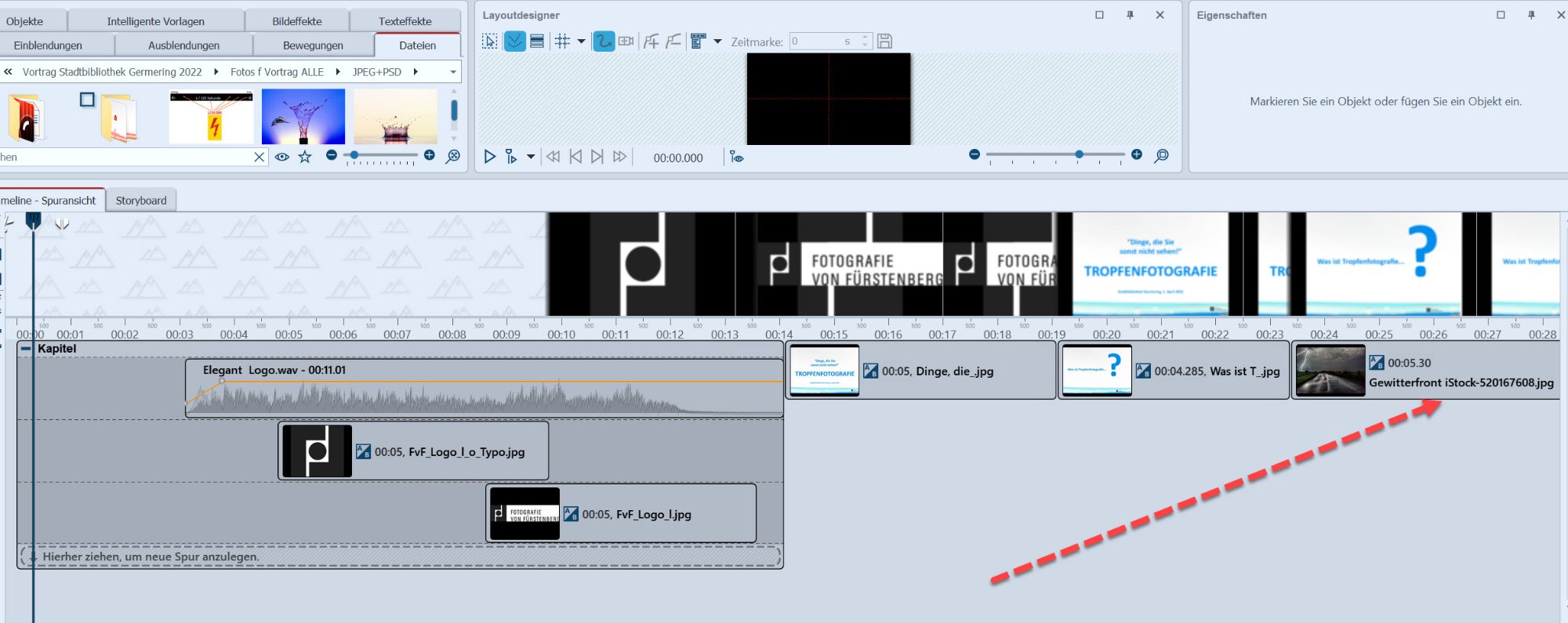 ... einfach zum Beispiel aus dem Objektfenster das Kapitelobjekt in die Timeline ziehen. Und schon hast du beliebig viele Spuren. In die obere Spur fügst du dein Gewitterbild und in die Spur darunter dein Audioobjekt ein.