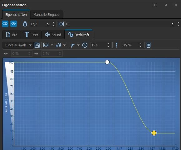 Zeitmarke 2 (10 sek): ab der 10. Sek verringerst du bis zur 15. Sek die Deckkraft z.B. auf 15%
