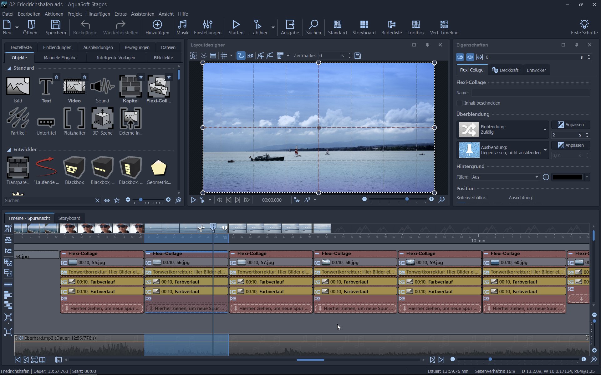 Ich habe eine kleine Seria von Bildern zusammengestellt, denen jeweils eine Tonwertkorrektur und zwei Farbverläufe zugeordnet sind. Bild und dazu gehörige Effekte liegen in einer eigenen Flexi-Collage, die die Überblendeinstellungen "Einblendung: Zufällig" / "Ausblendung: Liegen lassen..." hat. Das Bild selbst hat keine Einblendung, die Ausblendung ist ebenfalls auf "Liegen lassen" gesetzt.