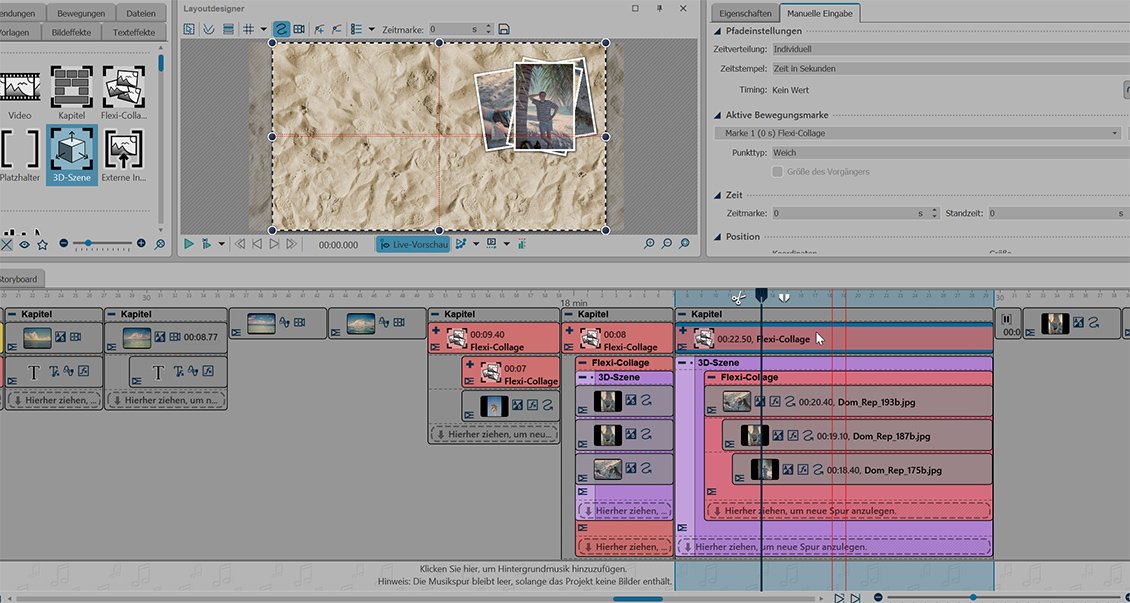 Wie im Bild sichtbar, befinden sich die 3 Bilder in einer Flexi-Collage und diese wiederum in eine 3D-Szene. Wenn ich die Bilder jetzt über Bewegungspfad einfliegen und stapeln lasse, dann müssten sich die Bilder aufeinander stapeln. Ohne 3D-Szene tun sie das auch. Mit der 3D-Szende blitzt immer kurz das einfliegende Bild als unterstes Bild kurz auf bevor es sich stapelt. Ist das normal? Oder wie kann man das umgehen. Die 3D-Szene brauche ich ja noch anschließend für das kleine Bilderhaus.