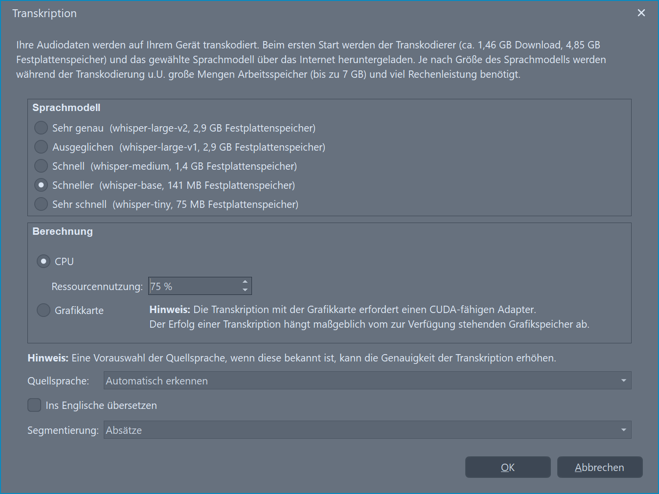 Wenn Sie die Transkribierung zum ersten Mal benutzen, wird auf alle Fälle erstmal unser Transkriptor heruntergeladen.