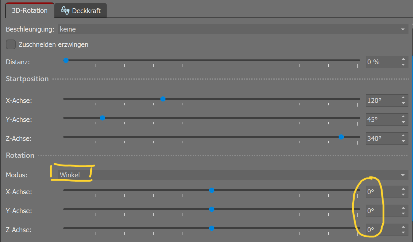 Du setzt 2 Bewegungsmarken im Abstand von meinenthalben 2 Sekunden. Für die Marke 1 setzt Du Deine Ausgangswerte in die Spalte Drehung für die entsprechenden Achsen ein, für die 2. Marke setzt Du dann für die 0-Werte für die x, y und z-Drehung ein.