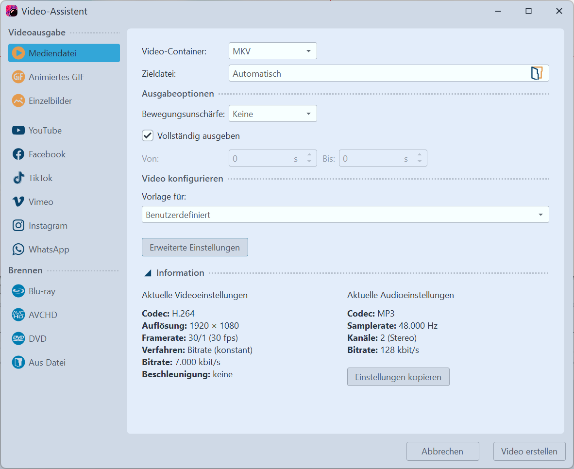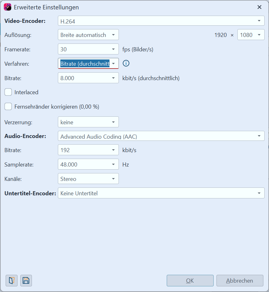 Ansonsten kann man ja auch in den erweiterten Einstellungen noch das ein oder andere festlegen (Verfahren, Bitrate o.ä.)