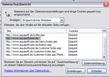 Leider klappt es mit den Cookies immer noch nicht obwohl ich alles probiert habe was in den anderen Links beschrieben wurde. :( IE 6.0 akzeptiert nicht das es die Cookies von Aquasoft anlegen soll.Nur mit dem uralten Netscape Navigator klappt es problemlos.Ich weiß leider nicht wo das Problem liegt.