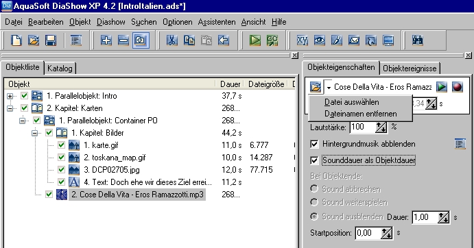 LOL - tatsächlich, da ist das gesuchte Ding... Tolle Idee, die Funktionalität zu verstecken *kopfschüttel*Steffen Binas hat geschrieben:Bei den Objekteigenschaften ist neben dem Dateinamen für den Sound ein Ordner-Symbol. Wenn Sie darauf klicken, bekommen Sie die zwei Menüpunkte.