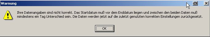 ich habe zwar schon alles ausprobiert, aber dennoch habe ich es noch einmal versucht. Damit ja das Anfangsdatum früher ist, habe ich den 1.1. 2004 eingegeben. Beim Enddatum war 30.3.2200 gestanden. Dieses Datum habe ich markiert und wollte 31.12.2006 eingeben. Die Markierung wurde noch angenommen und bei der Eingabe der ersten Zahl kam diese Meldung.