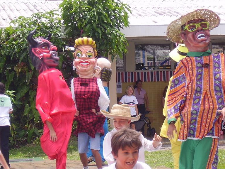 So feiern wir in der Schule den costaricanischer Unabhängigkeitstag. Die Puppen sind ca 2,5 meter große Drahtgestelle, die von Lehrern getragen werden. Dazu gibt es landestypische Musik. Und von Schülern zubereitetes Essen auf costaricanische Art.