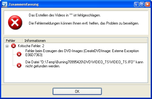 Danach wollte ich die MPEG-Datei auf DVD brennen lassen. Der Vorgang brach nach einigen Minuten mit der beigefügten Fehlermeldung ab.