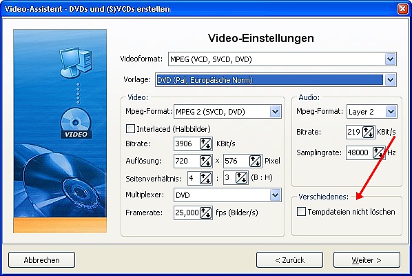 Es bleibt also nur die Möglichkeit, die Häkchen vor Erstellung der Mpeg-Datei zu setzen. Dann kann ich anschließend die Mpeg-Datei beruhigt wieder löschen und mit einem externen Brennprogramm beliebig viele DVDs brennen.