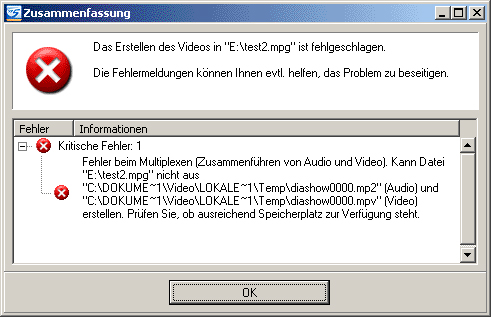 Jetzt können wir nicht mehr brennen, also haben wir versucht den Film nur als mpg Film zu exportieren. Wird abgebrochen, wegen angeblich zu geringem Speicherplatz, kann ich nur grinsen bei ner Platte mit 160 GB, auf der 100 GB frei sind und die Partition mit NTFS formatiert ist.