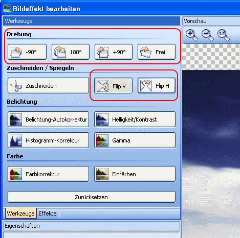 Im "Bildeffekt bearbeiten"-Fenster, welches man über die Funktion "Bild optimieren" erreicht, gibt es ja die diveren Buttons für die Drehungen.