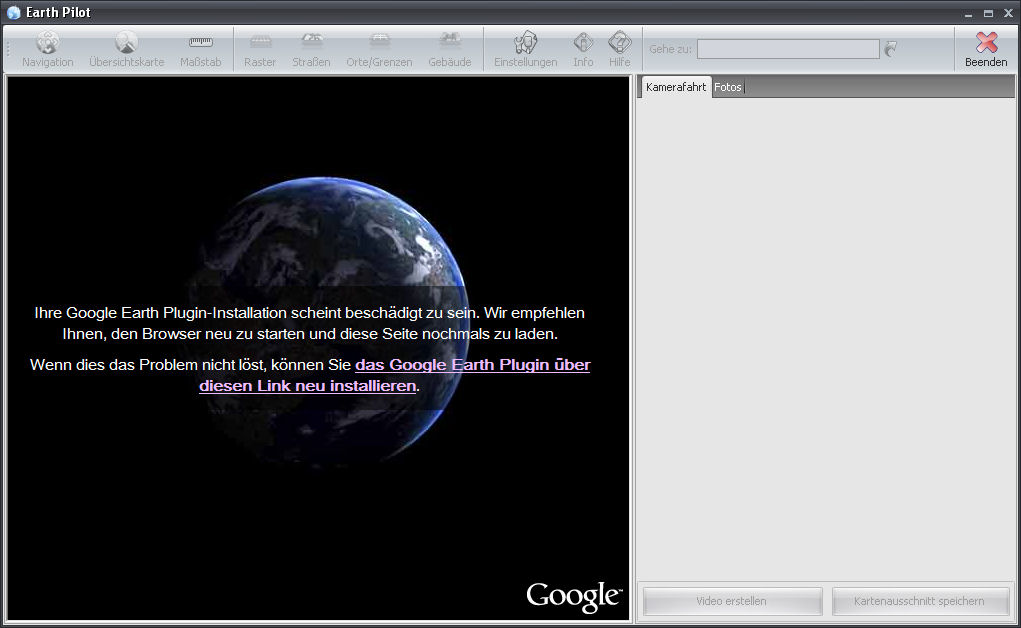bitte aktualisieren sie zunächst Google-Earth. Falls der Earth Pilot weiterhin nicht funktionieren sollte,