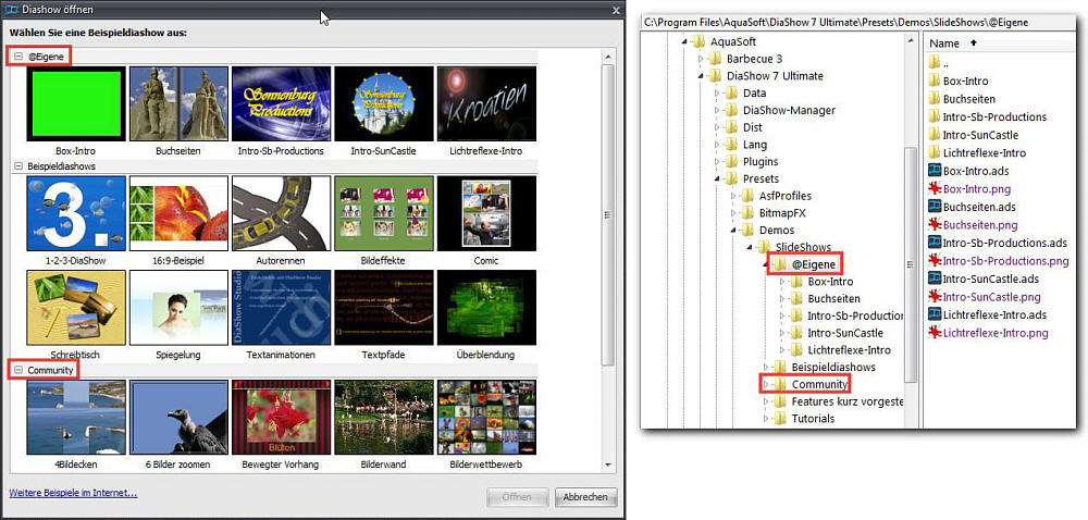 Unter "C:\Programme\AquaSoft\DiaShow6\Presets\Demos\SlideShows\" befinden sich ein paar Ordner von Aquasoft. Hier habe ich einen eigenen Ordner "Community" erstellt, in dem ich andere Vorlagen oder Beispieldiashows aus dem Downloadcenter speichere.