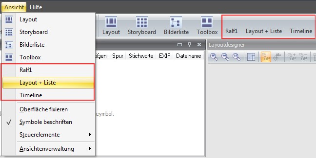 Damit die Ansichten auch oben in der Iconleiste neben "Layout", "Storyboard", "Bilderliste", "Toolbox" erscheinen, legst Du unter: