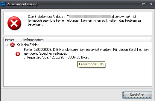 Meine Diashow besteht aus Fotos und Videos. Die Gesamtlänge sollte ca. 25 Minuten betragen. Es werden jedoch nur ca. 2 Minuten der Ausgabedatei erzeugt, danach bricht der Vorgang ab und ich erhalte die Fehlermeldung.