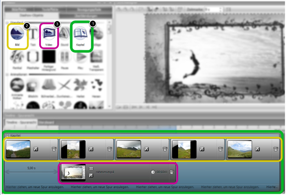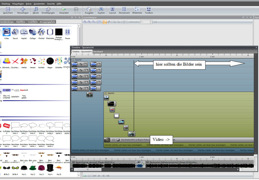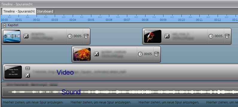 Ich vermute, Sie haben nur eine Spur in der Diashow, bei der die Bilder und das Video hintereinander ablaufen und möchten aber, dass das Video, bzw dessen Ton und die Fotos gleichzeitig ablaufen, damit Sie eine Art Hintergrundmusik haben.