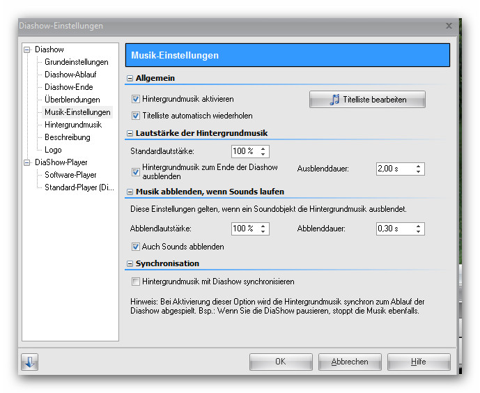 Ich verwende Diashow 7 Ultimate. Das Häkchen bei ist drin bei Hintergrund Musik deaktivieren. Werde also die DS wieder rendern und mit neue Einstellung dann brennen.